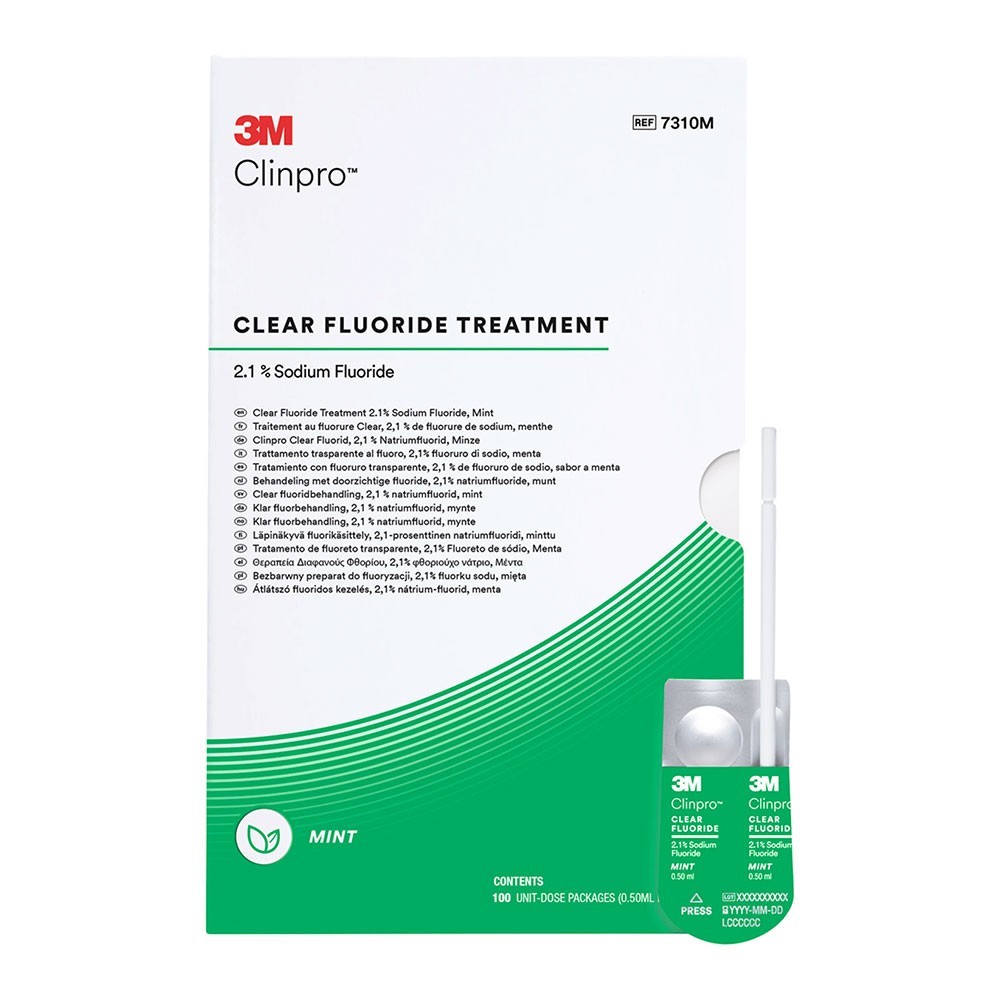 3M™ Clinpro™ Clear Tratamiento de Flúor es una fórmula a base de agua y libre de colofonia que está lista para aplicar y proporciona protección a las superficies del esmalte y la dentina.